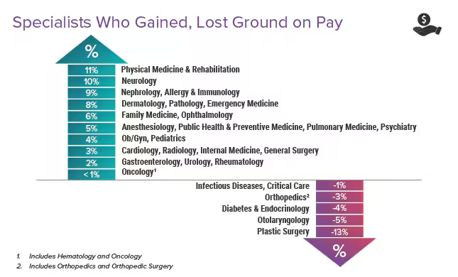 Specialist compensation changes ranged from +11% to -13%, with some surgical specialities experiencing salary growth and others declining.